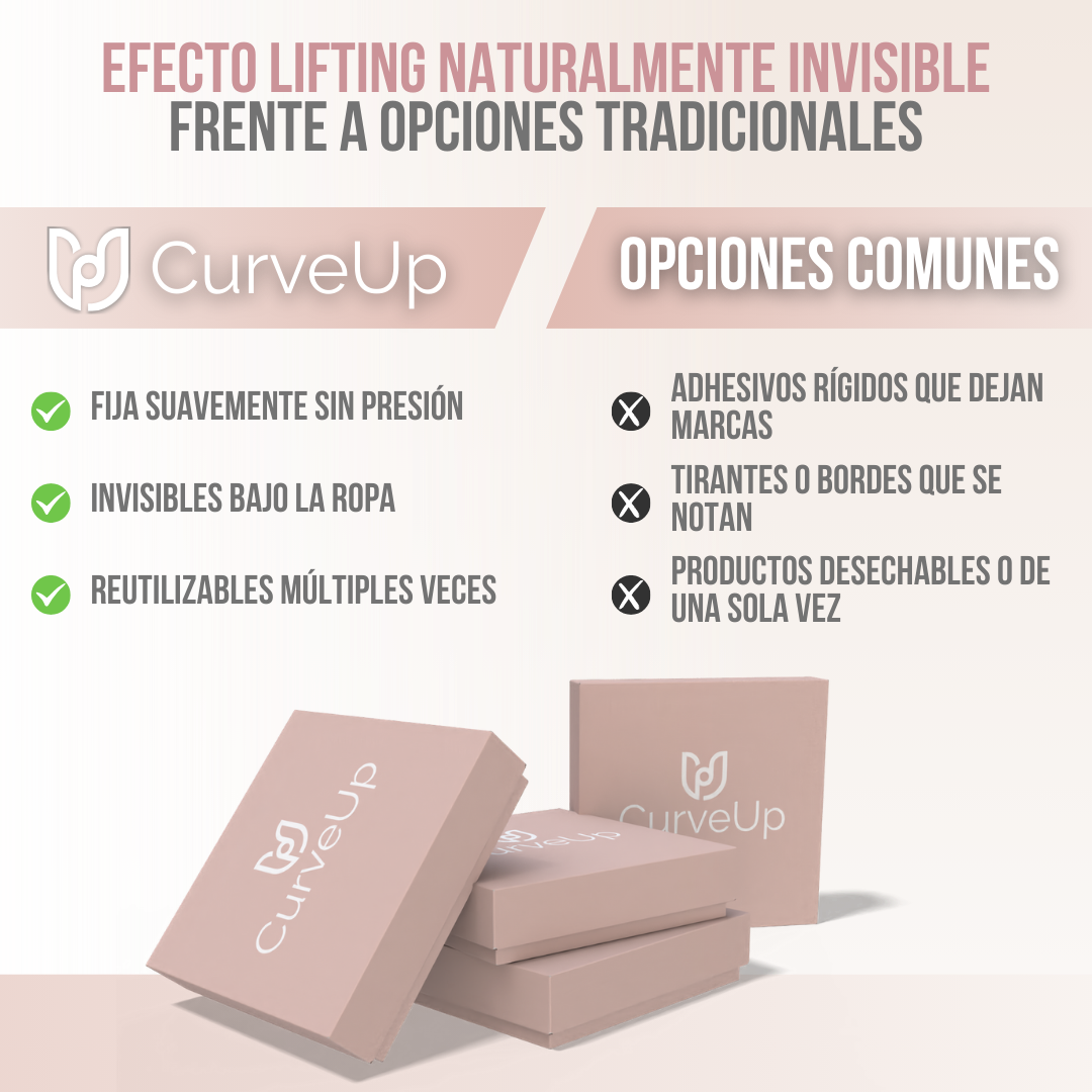 Ya sea que bailes, camines o te ejercites ligeramente, CurveUp™ se mantiene firmemente en su lugar, evitando deslizamientos o incomodidades. La fórmula de alta calidad y durabilidad garantiza que el adhesivo funcione de manera constante, proporcionando resultados confiables durante todo el día y la noche, sin comprometer la piel ni la comodidad.