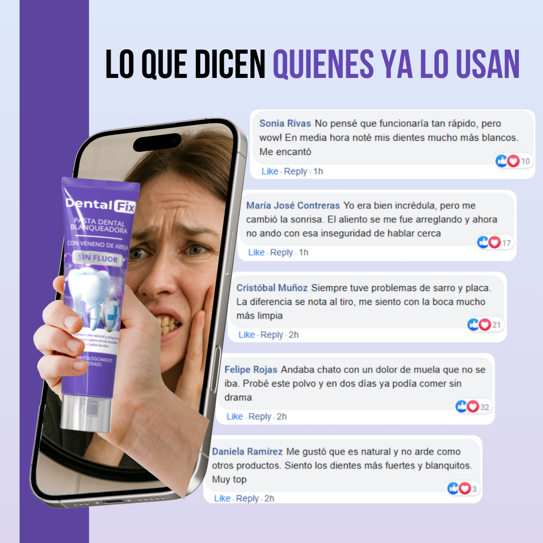 Dental Fix™ combina veneno de abeja y extractos herbales para ofrecer un blanqueamiento progresivo sin agresividad. A diferencia de pastas abrasivas, su fórmula actúa de manera respetuosa con el esmalte y las encías. Con el uso constante, ayuda a devolver el brillo natural de los dientes. Es ideal para quienes buscan una sonrisa más blanca sin tratamientos invasivos. Resultados visibles, de forma natural.
