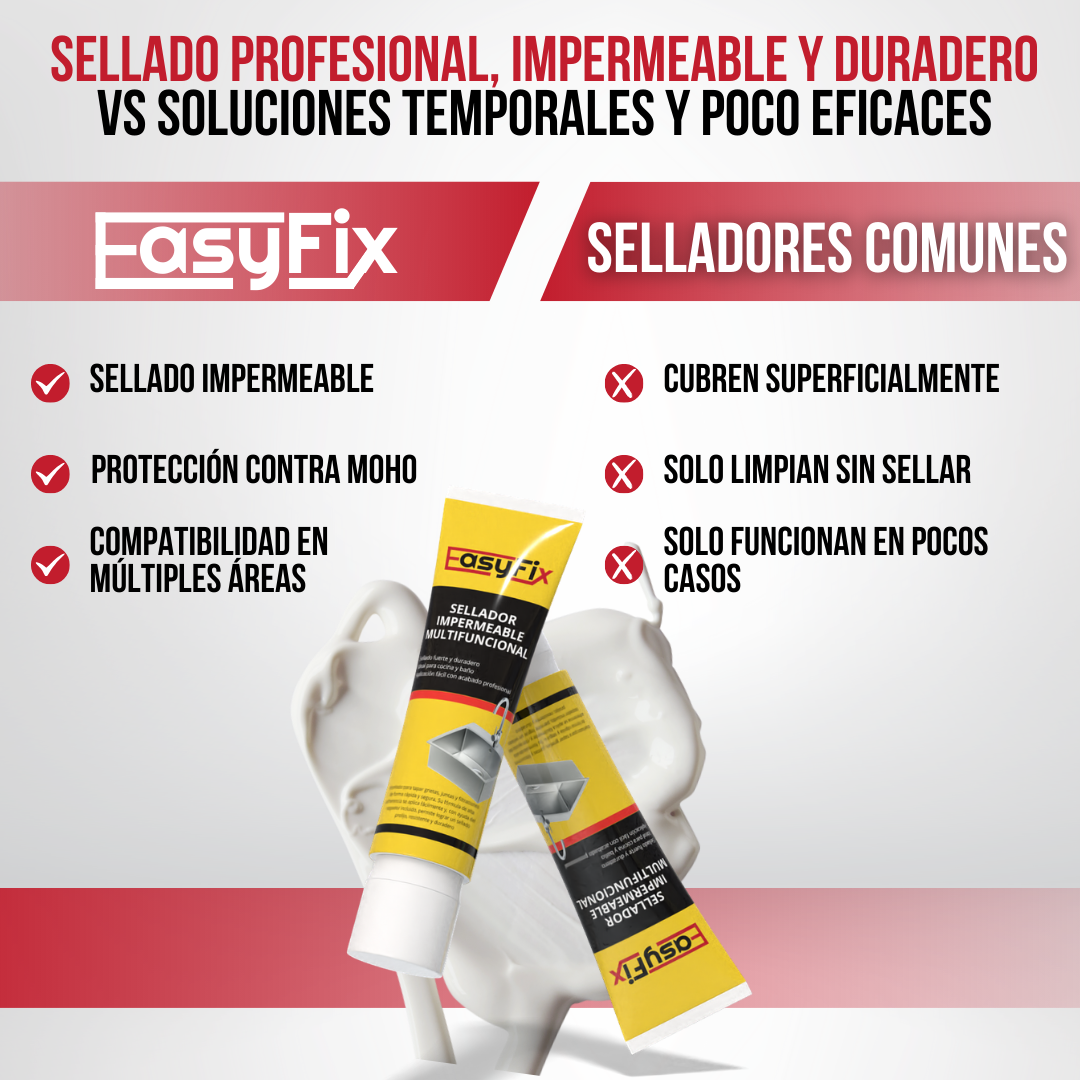 A diferencia de selladores comunes, Easy Fix™ combina impermeabilidad, alta adherencia y secado rápido en un solo kit. Incluye un raspador integrado, lo que facilita un acabado prolijo sin herramientas adicionales. No se cuartea ni se despega fácilmente, incluso en zonas de alto uso. Es una solución más duradera y práctica que las alternativas tradicionales. Menos mantenimiento y mejores resultados, tanto para uso doméstico como profesional.