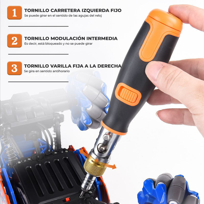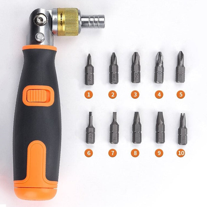 Esta herramienta versátil y compacta ofrece 10 puntas diferentes para abordar cualquier trabajo. Con su diseño ergonómico, proporciona un agarre cómodo y seguro. La función de trinquete ajustable permite trabajar en espacios estrechos con facilidad, haciendo de esta herramienta una adición esencial a tu caja de herramientas.