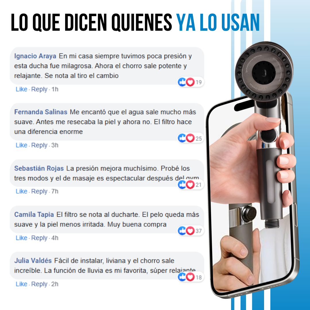 Otros usuarios señalan mejoras en la piel y el cabello gracias a su filtración, diciendo que “el agua ya no irrita”. El masajeador incorporado y la facilidad de instalación la convierten en una compra altamente recomendada por familias y hogares exigentes.