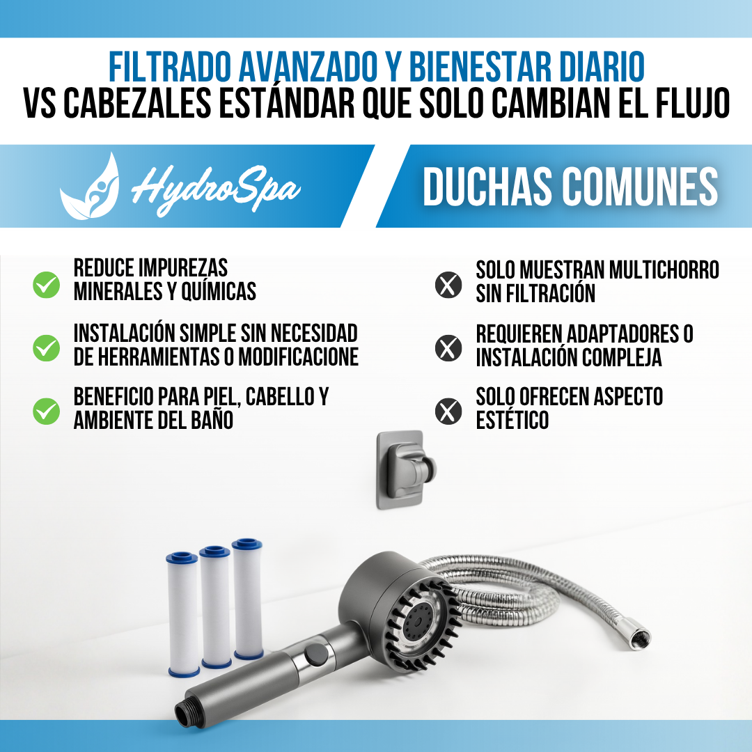 A diferencia de los cabezales comunes, HydroSpa™ combina alta presión, filtración profesional y múltiples modos, algo poco común en productos tradicionales. Además, incluye un cabezal masajeador de silicona, perfecto para relajar músculos y liberar el estrés diario. Su botón de parada instantánea permite controlar el flujo sin cortar el agua del grifo, lo que reduce el desperdicio y hace la rutina más cómoda. Es una opción más completa, eficiente y duradera que las duchas estándar del mercado chileno.