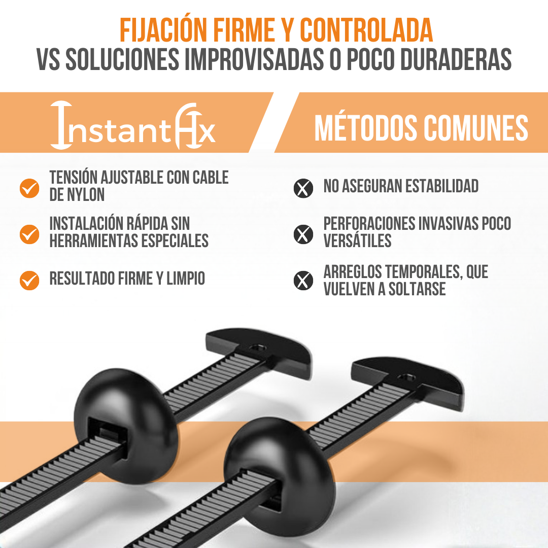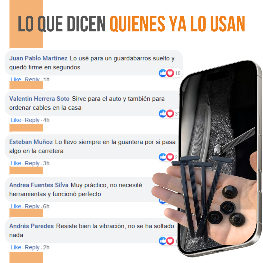 A diferencia de las bridas comunes, Instant Fix™ incorpora dientes de doble cara con autobloqueo permanente, lo que evita que se suelte con vibraciones o movimiento. Fabricado en nailon PA66 de alta resistencia, soporta rayos UV, humedad, calor extremo y frío intenso. Es una solución más segura, duradera y profesional que las amarras tradicionales o tornillos estándar.