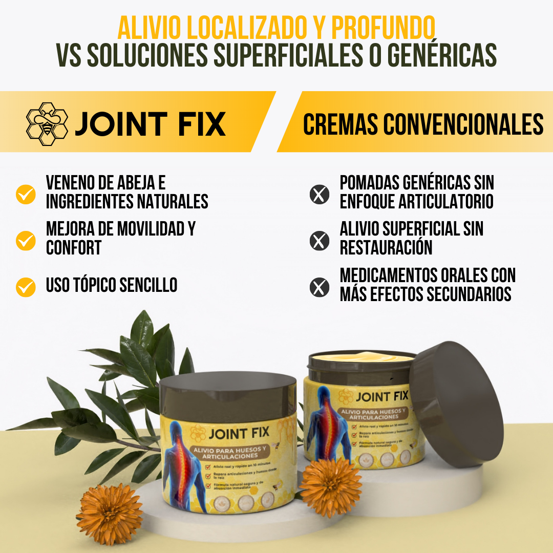 Joint Fix™ combina veneno de abeja, cúrcuma, miel y aceites esenciales para ofrecer un alivio efectivo del dolor articular y óseo. Su fórmula natural ayuda a calmar molestias provocadas por el desgaste diario, sobrecarga física o falta de movilidad. Con el uso constante, contribuye a reducir la sensación de rigidez. Es una alternativa ideal para quienes buscan alivio sin soluciones agresivas. Cuidado diario con ingredientes de origen natural.