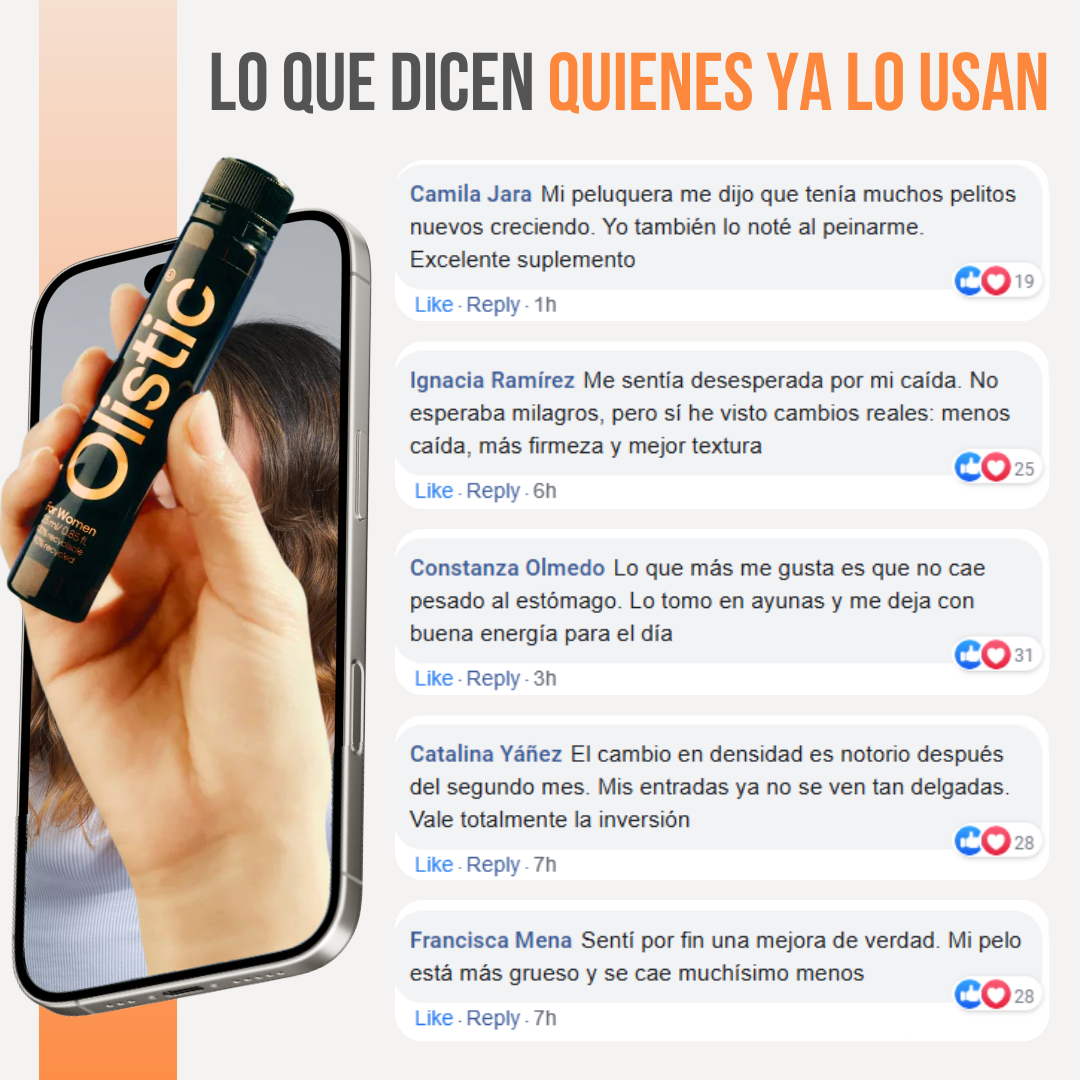 Usuarios en Chile y otros países destacan que Olistic™ reduce la caída en pocas semanas, mejora el volumen desde el mes 2 y genera cambios notorios en densidad y grosor entre los 3 y 6 meses. También mencionan que el sabor tropical facilita la toma diaria y que el formato en ampollas es práctico para llevar a cualquier parte. Los testimonios resaltan menos caída en la ducha, mayor firmeza del cabello, brillo natural y una sensación de recuperación capilar real, motivo por el cual muchos continúan el tratamiento a largo plazo.