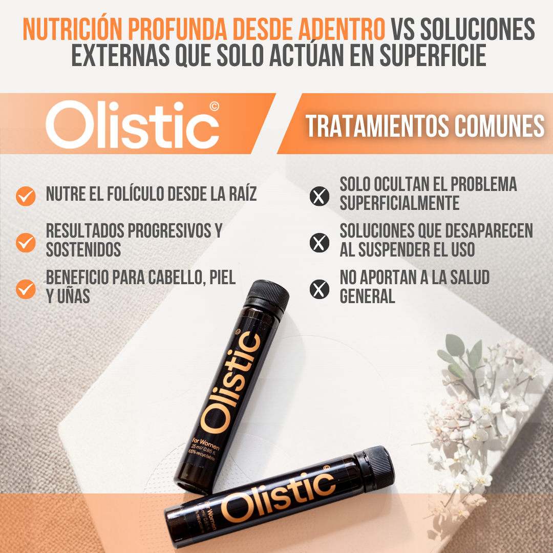 Mientras muchos suplementos capilares se enfocan solo en una vitamina o un mineral, Olistic™ ofrece una fórmula completa con más de 30 ingredientes avalados por estudios clínicos, diseñada para abordar varios factores simultáneamente. No contiene hormonas, fármacos, gluten ni aditivos sintéticos, lo que lo convierte en una alternativa segura, consciente y eficaz. A diferencia de shampoos o tónicos externos, actúa desde el interior, mejorando el ciclo de crecimiento capilar y fortaleciendo el folículo antes de que el cabello se caiga.
