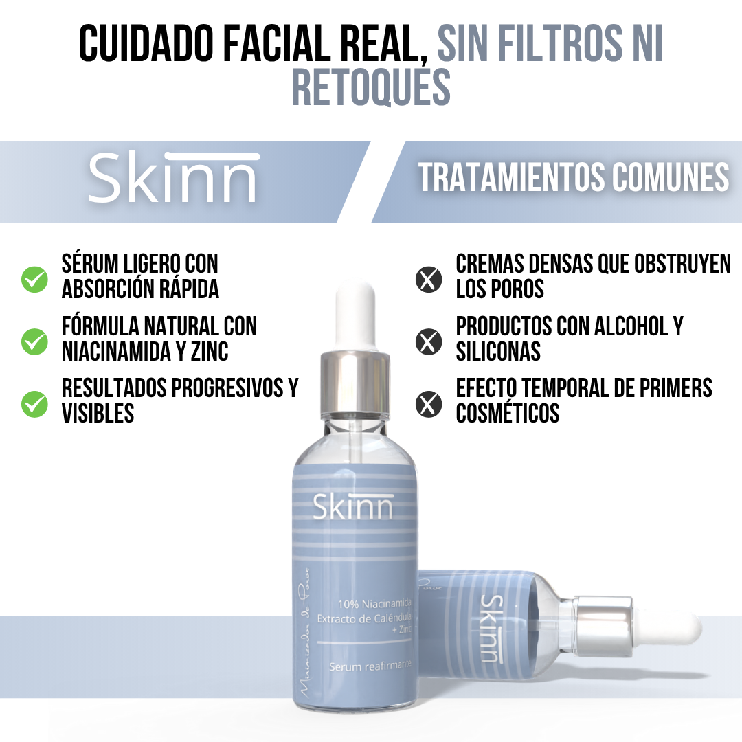 Skinn™ ha sido diseñado específicamente para quienes luchan con poros dilatados, textura irregular y exceso de sebo. Su fórmula ligera y avanzada combina niacinamida, ácido salicílico y extracto de Rosa Canina para regular la producción de grasa, limpiar profundamente los poros y prevenir la congestión.