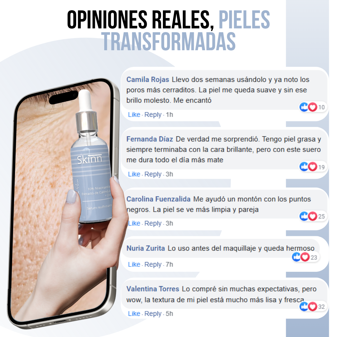 La hidratación es clave para la apariencia de los poros, y Skinn™ incorpora ácido hialurónico y niacinamida para proporcionar una nutrición profunda sin sensación grasa. Esto mantiene la piel flexible, tersa y con un aspecto más saludable, ayudando a suavizar líneas finas y a mantener un brillo natural. Con su uso diario, tu cutis se verá más refinado, uniforme y con poros visiblemente reducidos, convirtiendo este suero en un paso esencial para quienes buscan un rostro impecable, fresco y cuidado al máximo.