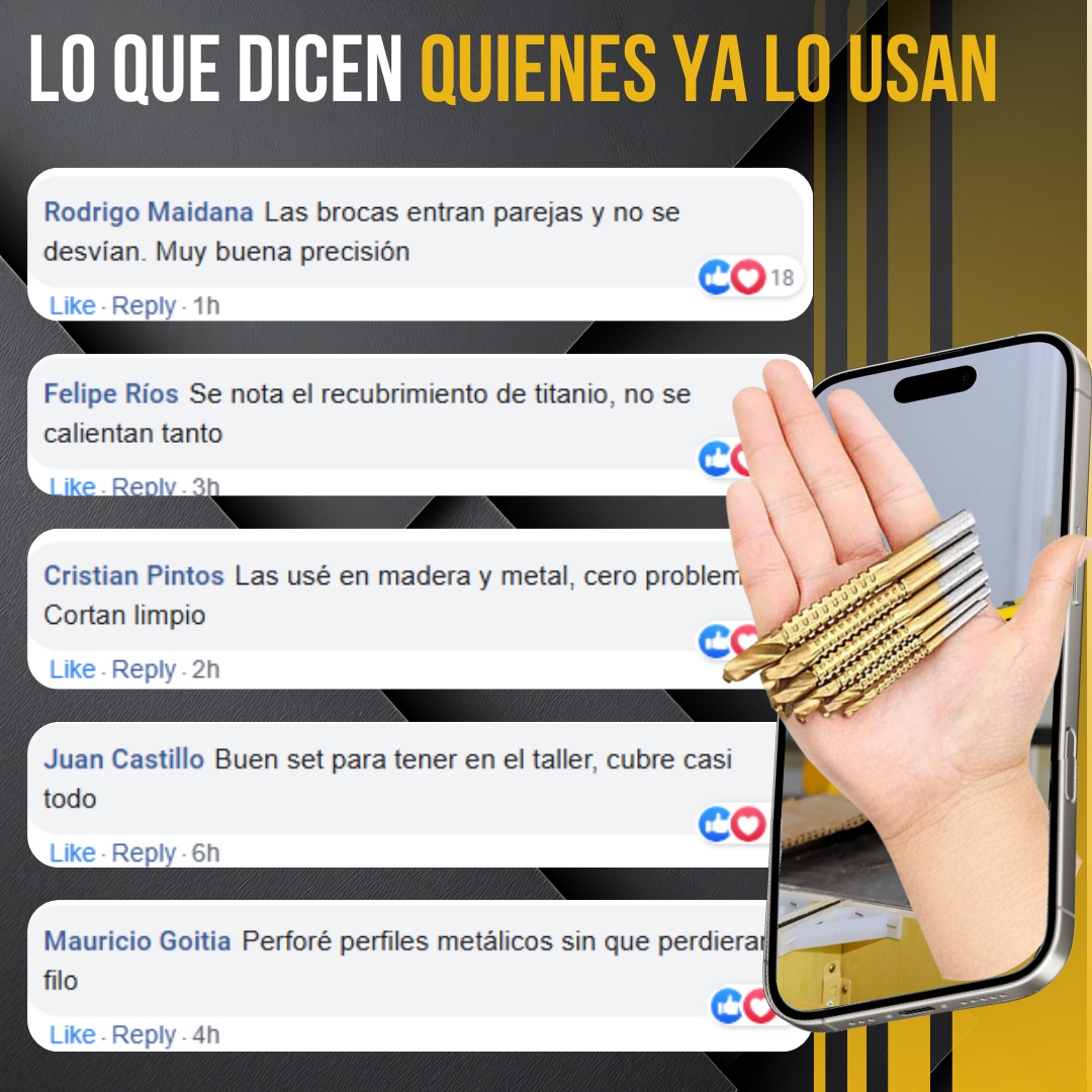 Quienes ya usan Titan Max™ destacan la facilidad de uso y el acabado limpio que dejan en cada perforación. Muchos resaltan su rendimiento en madera y metal sin pérdida de filo. También se aprecia su resistencia al uso continuo, ideal para trabajos repetitivos. Carpinteros y aficionados coinciden en que es un set práctico y duradero. Un producto bien evaluado por su calidad, precisión y versatilidad.